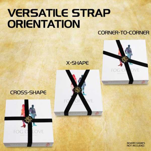 Includes 3pcs of Large-sized bands and 2pcs of Medium-sized bands that can be put around board game boxes to protect the games and keep the lids in place during travel. The bands are made of a premium elastic fabric that won't snap or break like rubber alternatives and can stretch to accomodate most games on the market. The unique gripping texture underneath each band was designed to provide a protective hold that will last many stretches.