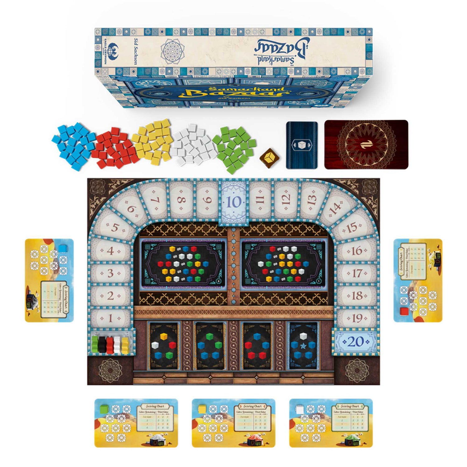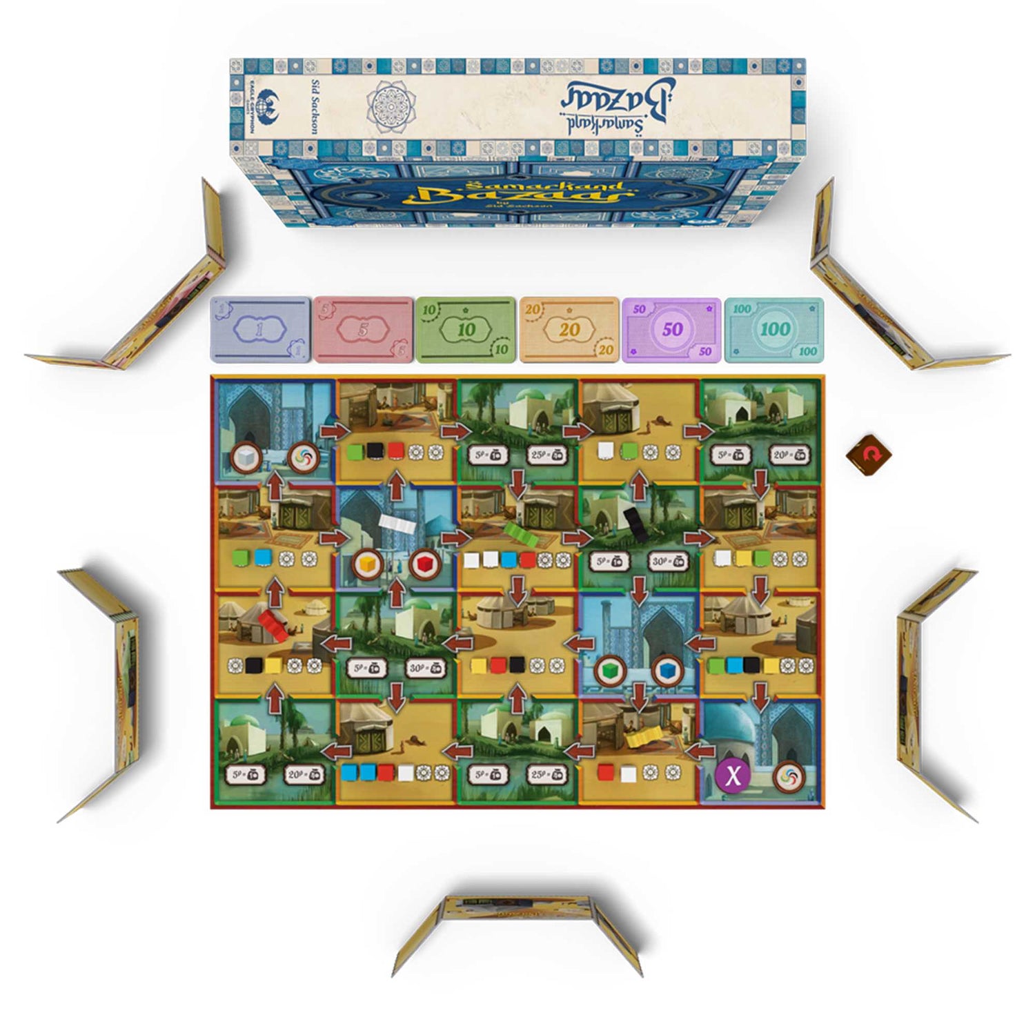 In Bazaar, players attempt to gain the right combinations of goods through skillful trading; then purchasing the wares displayed in the Bazaar. The number of goods left over determines the points awarded by the various wares following the transaction, so efficiency is critical.When trading, players are confined by the current rates posted at the Exchange, which change in every game. After all wares from two stalls have been completely sold out, the Bazaar closes, and the player with the highest score wins!