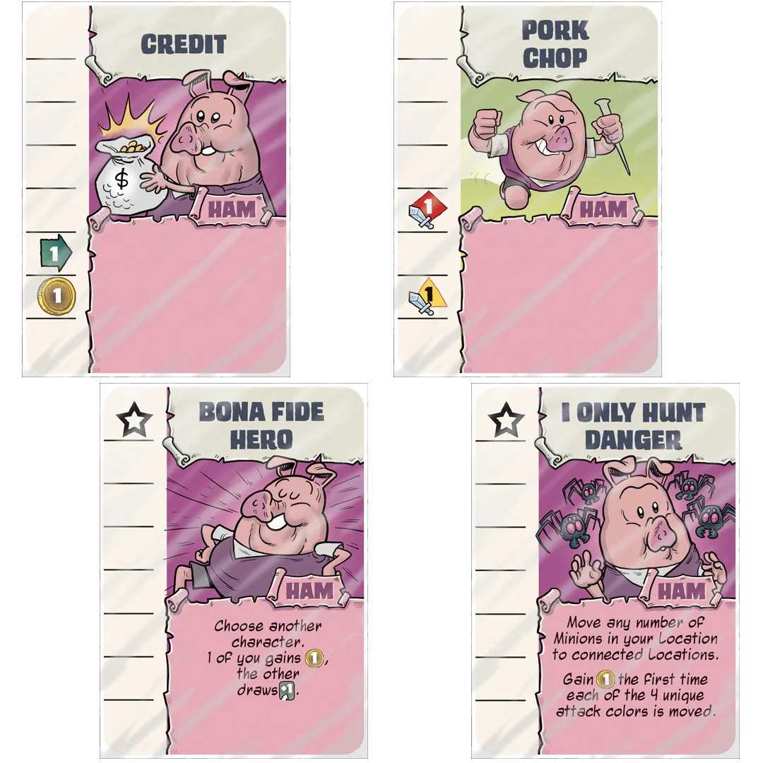 Ham Helsing is a cooperative adventure board game based on the graphic novel series about a reluctant monster-hunting pig. Join Ham, Ronin, Malcom, and Lobos as they attempt to save the world! Using a card-crafting system with transparent upgrade cards, protect locations from endless swarms of minions while powering up and improving your skills. Can you power up fast enough to stop the Villain from destroying Mud Canyon and save the day?