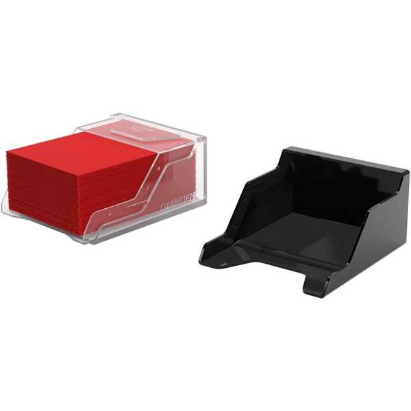 The Bastion 50+ is a very compact and rock-solid deck box to safely protect up to 45 doublesleeved cards in Thick Inner Sleeves. It is ideal for decks with 55+ double-sleeved cards in standard inner sleeves and also holds Mini Snap and Slide Card Cases as well as Cube Pockets. Due to translucent materials and smart positioning of the closing flaps, the top card is fully visible from the outside without opening the box. The innovative secure click-lock mechanism protects your deck while still allowing easy access. The Bastion consists of 2 symmetrical parts that easily convert into a card pile and discard pile holder.