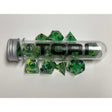 This seven piece dice set features dice filled with glittering liquid that swirls when rolled. The set comes in a T.C.R.I. mutagen vial themed package and includes full-sized traditional polyhedral dice (D4, D6, D8, D10, D10%, D12, and D20).