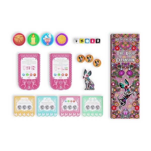 The Xolo Expansion introduces the xoloitzcuintle to Die of the Dead. These loyal dogs can be used to guide other players to caskets, encouraging them to pick ones which benefit you, for more dice manipulation options on the future. Featuring more ways to mainpulate dice and each other, tokens, casket boards and custom dice, The Xolo Expansion takes everything people love about Die of the Dead and makes more of it.
