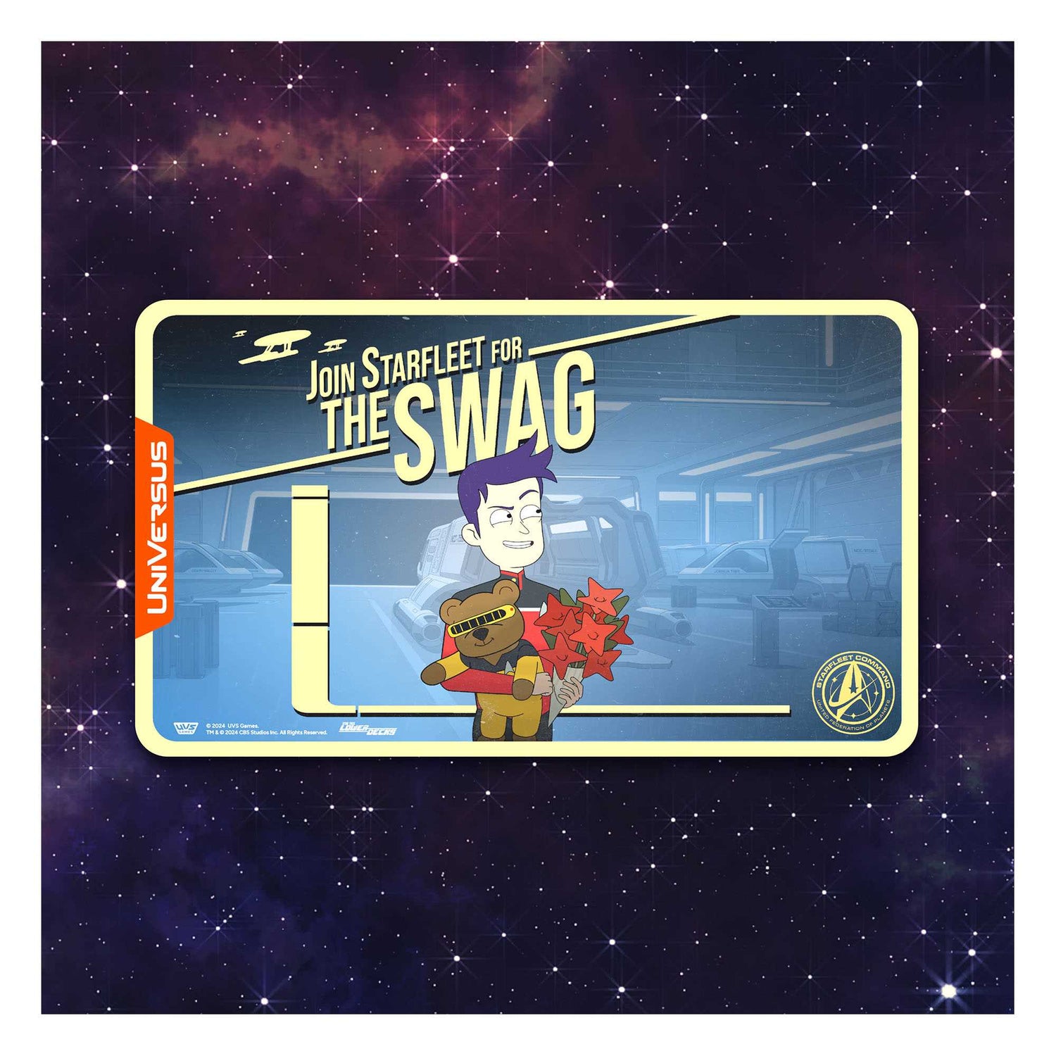 Why did you join Starfleet? For THE SWAG, of course! This high-quality STAR TREK: LOWER DECKS UniVersus playmat features Ensign Brad Boimler showing off some treasured souvenirs representing legends of the Alpha Quadrant. Each playmat comes packaged in a sturdy cardboard box--collect all five!