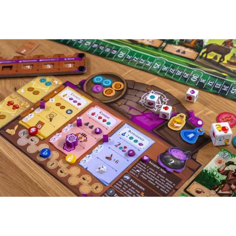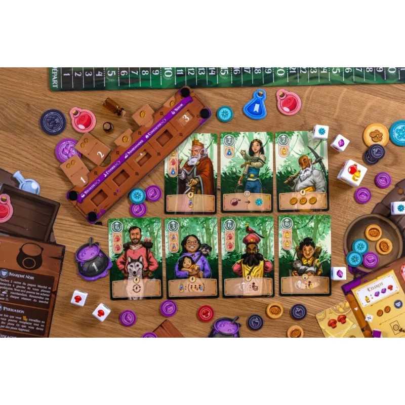 In Potions of Azerland you will, you guessed it, make potions! Gather resources from the forest, increase your knowledge in various potion types, go to the market to collect and trade goods, then make your potions to drink for unique powers or fulfill the orders of travelers who come to your town! Potions of Azerland utilizes a unique simultaneous action selection mechanism where understanding the goals of your opponents in each round will give you the upper hand. Decide whether to drink your newly made potions for temporary boost and prolonged powers or give them to an ever changing group of travelers for points and other bonuses. After 8 rounds the player who has garnered the most prestige will be the winner!