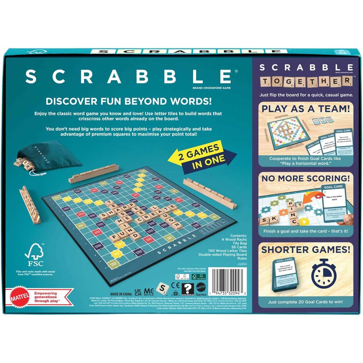 Two Games in One! Play the classic Scrabble game you know and love or flip the double-sided board and try Scrabble Together, specially designed for faster, more casual, cooperative playwith easy scoring!