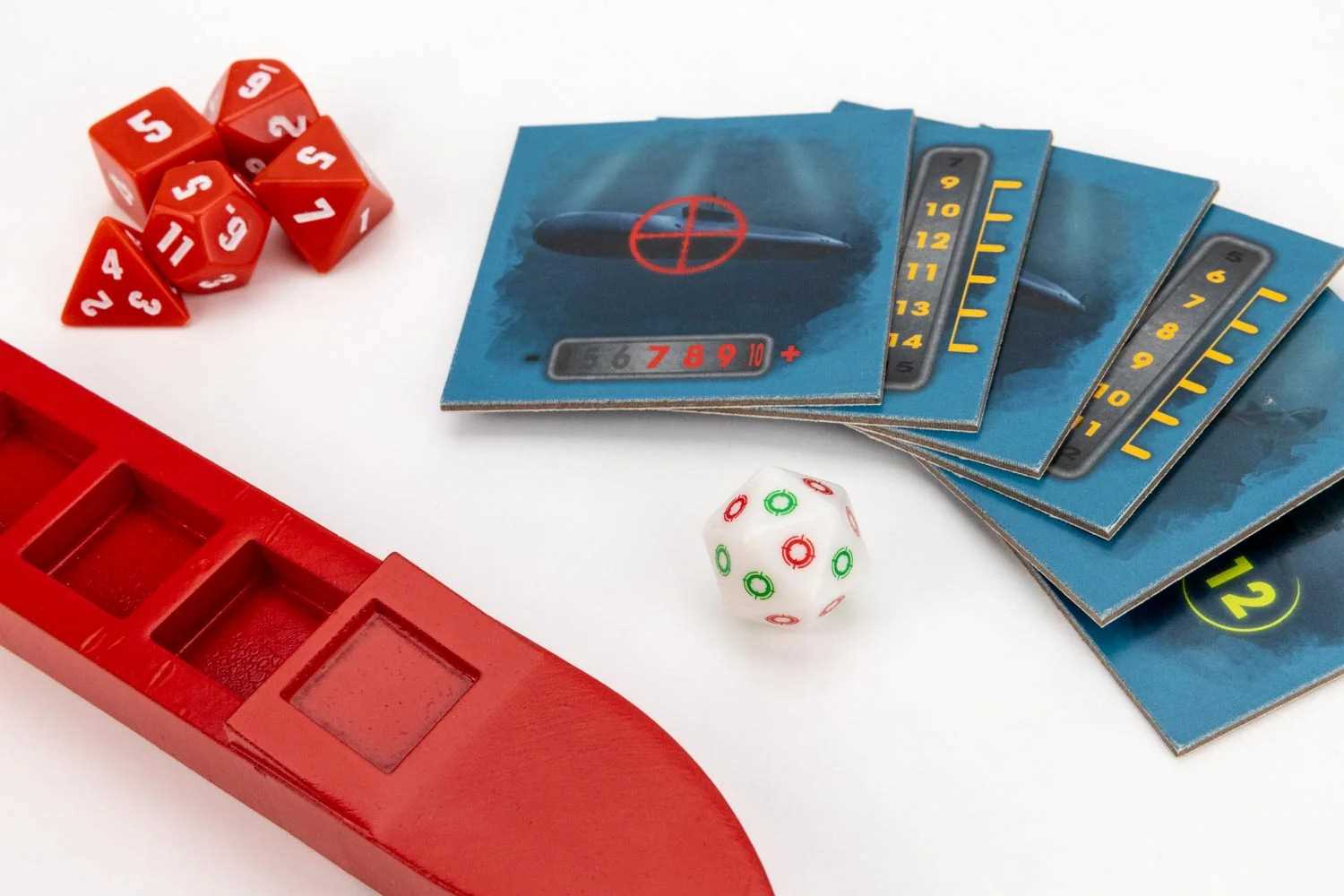 Take your Battleship fight underwater as you use dice to hunt for enemy submarines. Avoid mines, choose weapons and become the victor. This wild game combines memory cards, dice and dice launchers for incredible fun that can be learned in 5 minutes.