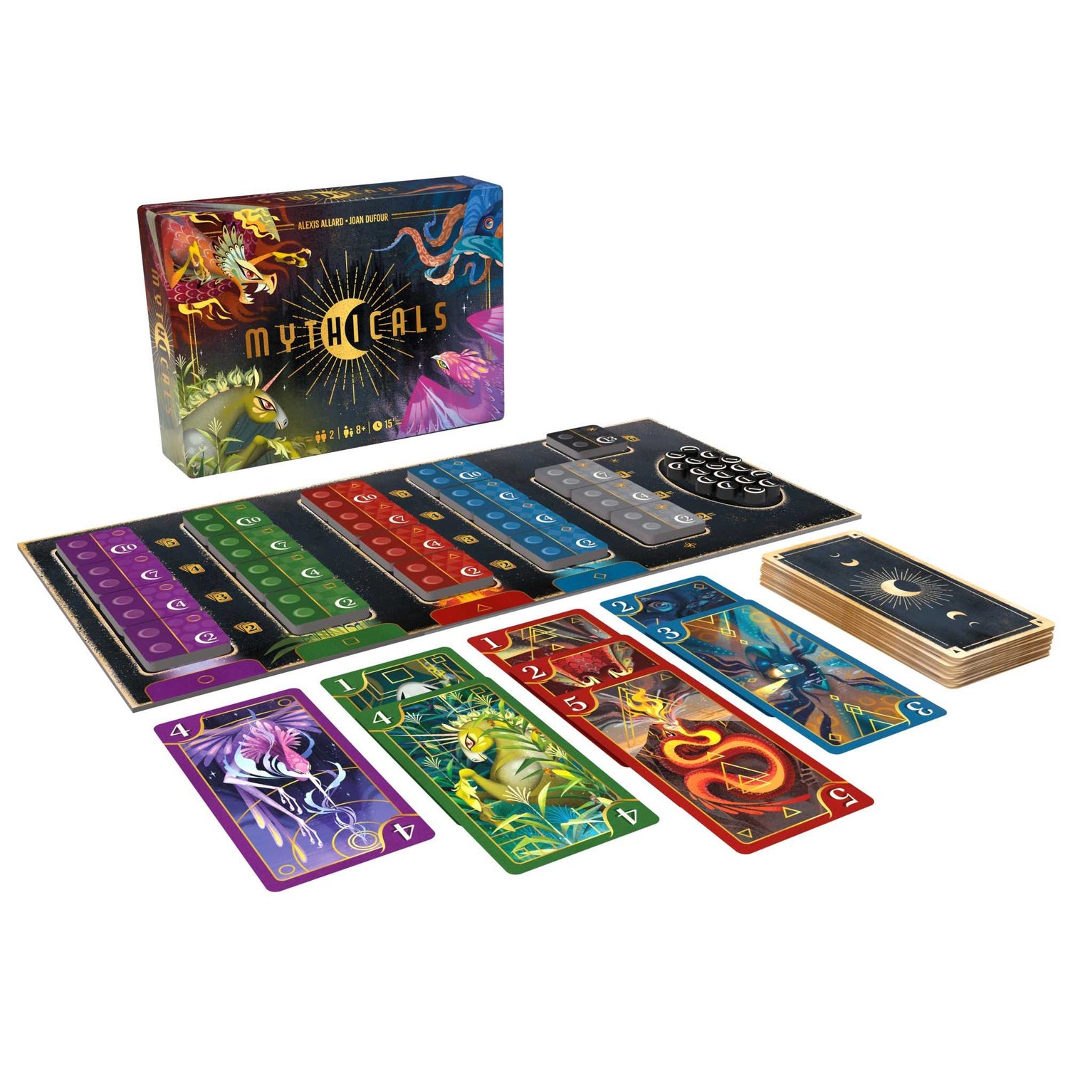 Mythicals is a tactical, risk-taking card-collecting game for two players. In this universe, each celestial creature holds the mastery of an element: water, air, earth, or fire. Study these creatures before the sun rises and learn all their secrets because the player with the greatest mastery of the elements at the end of the game wins! On your turn, collect cards representing the same elements by drawing three cards from the pile (and placing the reminding ones into the market) or by picking them from the market. If you can, discard a collection corresponding to a favor token (same elements + flush, different elements, same value...) and take the token.