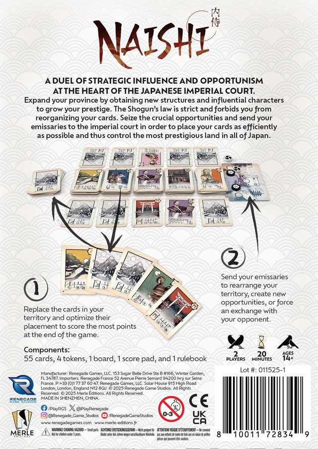A strategic duel at the heart of the Japanese Imperial Court! Expand your province by obtaining new structures and influential characters to grow your prestige. The Shogun’s law is strict and forbids you from reorganizing your cards. Seize the crucial opportunities and send your emissaries to the imperial court in order to place your cards as efficiently as possible and thus control the most prestigious land in all of Japan.
