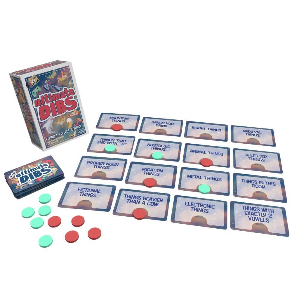 Ultimate Dibs is an area control team party game where your team is trying to connect categories one-at-a-time by calling dibs on things that match in the grid. Tokens are placed on the cards to indicate who is currently in control. If the opposing team disagrees, a vote is taken to uphold that spot. If the active team loses the challenge, their turn immediately ends. The goal is to lock in three spaces orthogonally or diagonally before the other team to win the game.