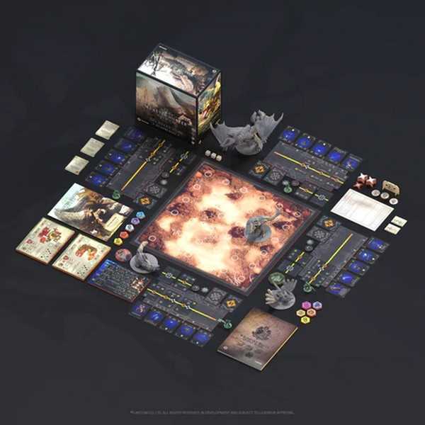 In this cooperative arena combat board game for 1-4 players set in an open world, it’s not you who dictates the flow of battle, but the monster you hunt — and each one is wildly different. With this core set, explore the arid Wildspire Waste and the monsters within — hard-headed Barroth, poisonous Pukei-Pukei, lurking Jyuratodus, horned Diablos, and menacing Black Diablos*. Hunt these dangerous creatures with the Insect Glaive, Charge Blade, Heavy Bowgun, or Switch Axe, crafting upgrades and honing your hunting skills with every hard-won piece of monster loot.