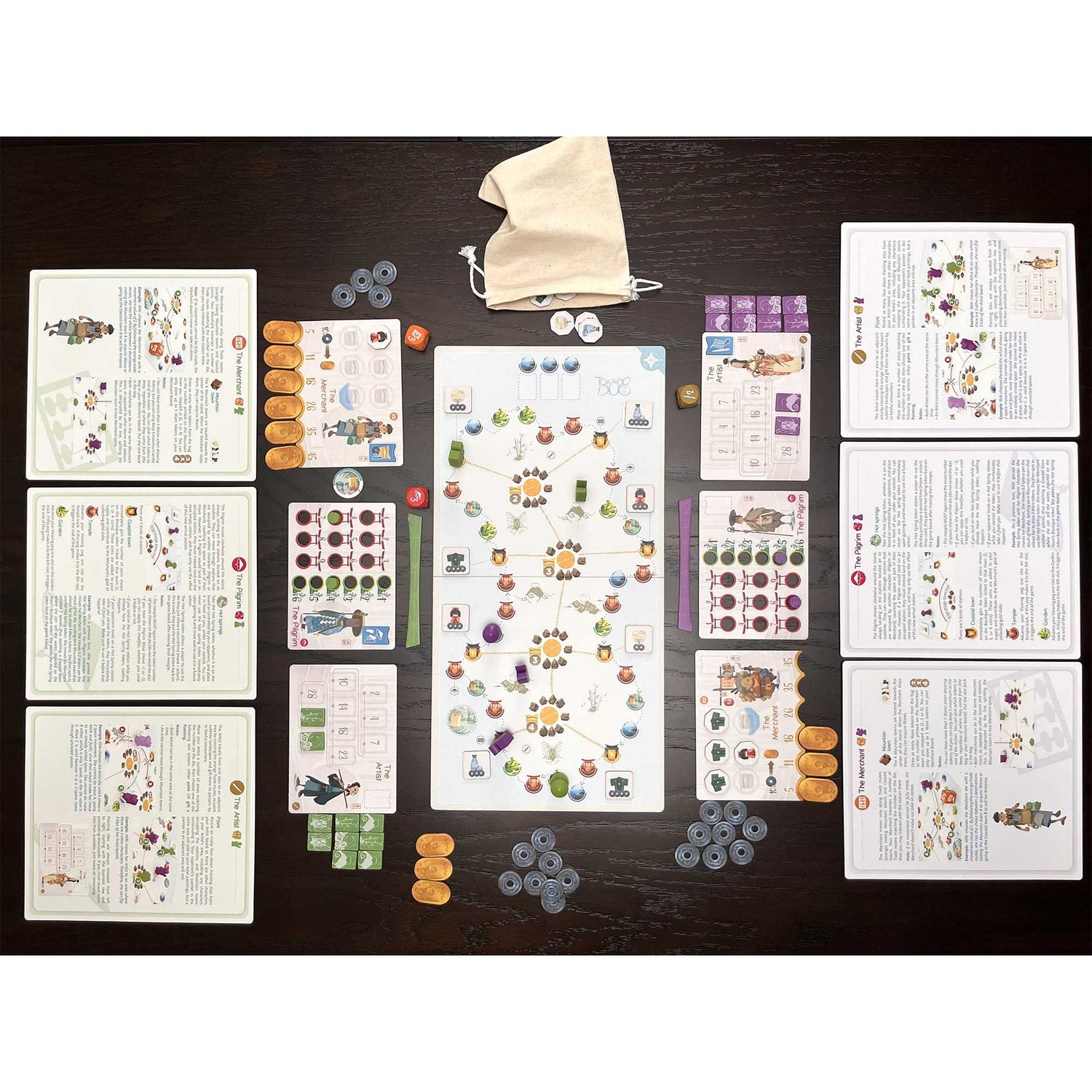 In Tokaido Duo, two players discover the smallest of Japan’s four main islands through a three-faceted spiritual journey. As the pilgrim, visit shrines, gardens, seashores, and hot springs. As the merchant, collect and sell traditional souvenirs. As the artist, paint a variety of beautiful vistas, and gift your paintings to locals. Gain points through each character’s discoveries, and live each journey to the fullest. If you do, your trek will grow into a life-changing experience!