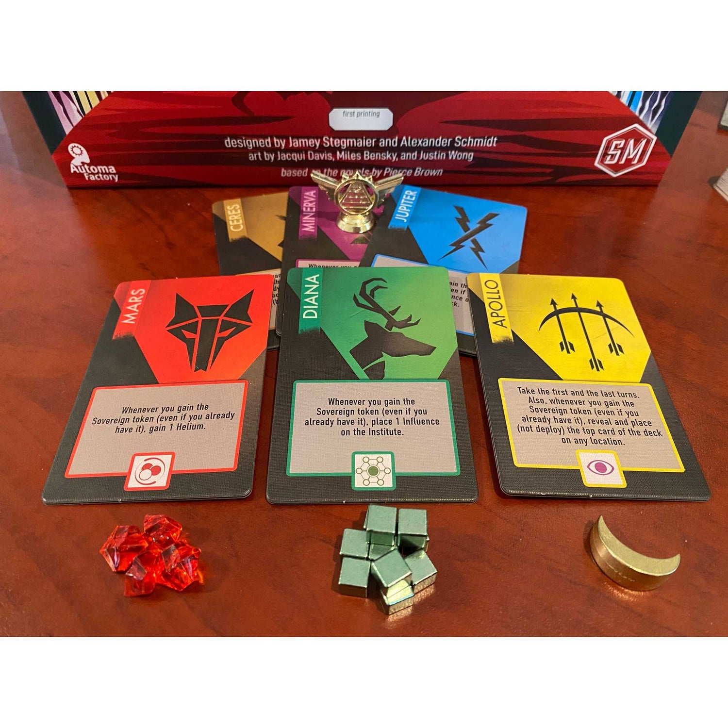 Enter the futuristic universe of Red Rising, based on the book series – specifically, the first trilogy – by Pierce Brown featuring a dystopian society divided into 14 castes. You represent a house attempting to rise to power as you piece together an assortment of followers (your hand of cards). Will you break the chains of the Society or embrace the dominance of the Golds?