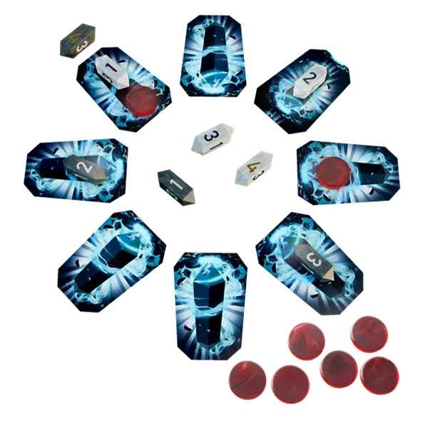 Obelus is a light-weight, 2-player abstract strategy game, playable in 10-15 minutes. Taking on the role of a powerful Mensor, you will summon obelisk shaped dice onto conflux cards, shift your obelisks according to the number showing, and banish your opponent’s obelisks. Through clever maneuvering, banished obelisks may be reformed, creating a rift that prevents further summoning on that conflux. You win when your opponent cannot legally summon or shift an obelisk!There are two ways to play Obelus: Pure mode or Chaos mode. Chaos mode involves some dice rolling, adding an element of randomness to thegame, whereas Pure mode offers “perfect information” with no randomness.