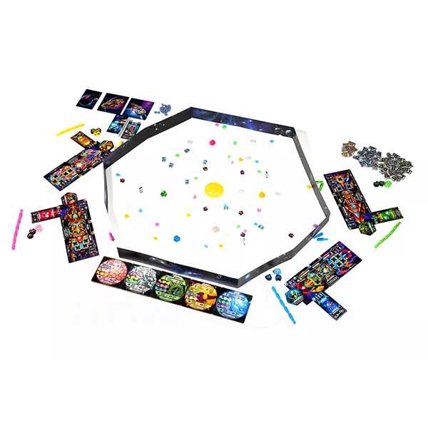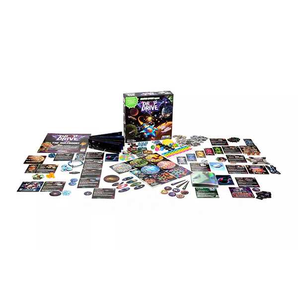 Drop Drive is a lightweight sandbox game for 2-4 players (5 with extra add-on pack), featuring a ""drop-style"" mechanic that assures no two games could possibly be the same. Drop Drive blends strategy with a novel spatial element that will challenge casual and hardcore gamers alike!THE BIG BANG! At the start of each game, objects of all kinds are dropped onto the table from a height of 4 to 5 inches. This creates a galaxy layout with infinite possibilities. You will then assume the role of an alien starship captain, exploring space, upgrading your ship, mining asteroids for precious resources, and landing on mysterious worlds to sell your cargo, pick up passengers, and collect strange alien specimens!