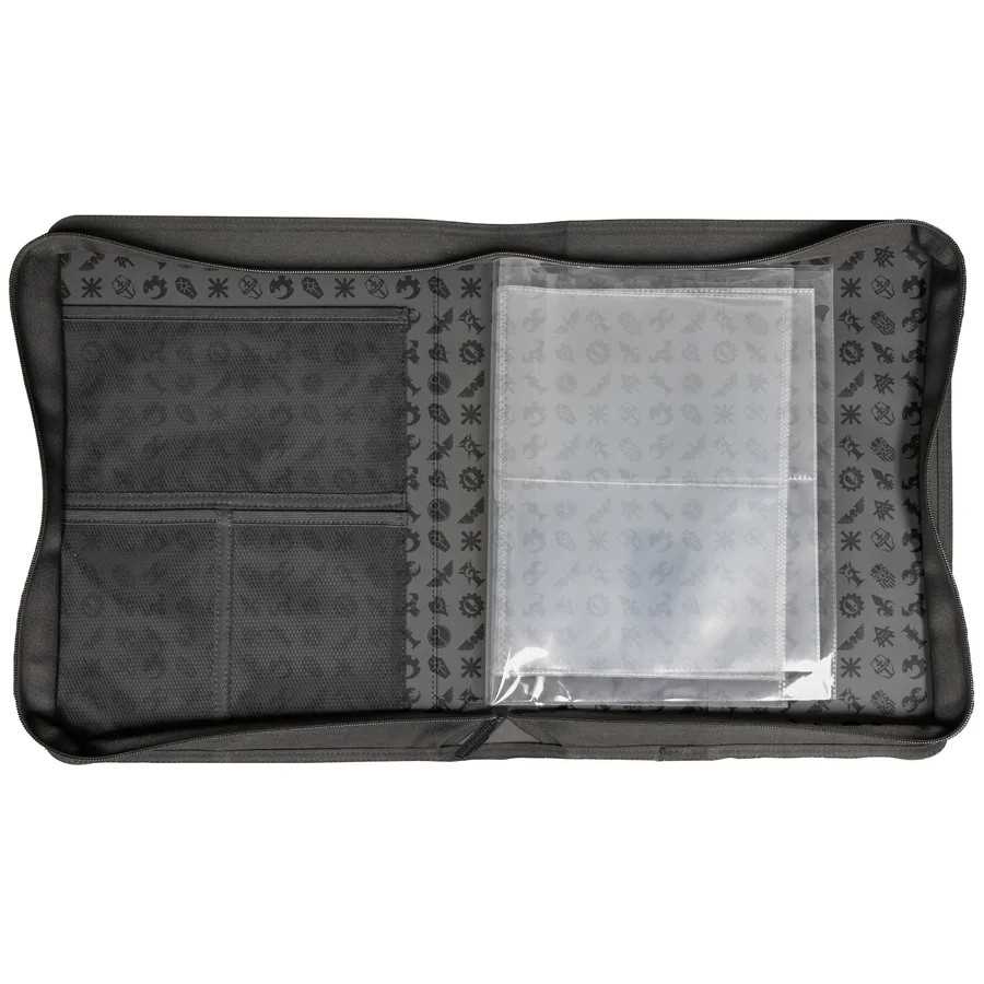 “In the grim darkness of the far future there is only war”, so prepare for battle with tabletop accessories for Warhammer 40,000! This Universal Codex Book Folio fits and protects your latest Warhammer 40,000 Codex or Core Book inside an easy-load back cover pocket. The textured leatherette cover features metal emblem accents, iconic grimdark war quote, and spot UV faction pattern on the interior. In between the covers you’ll find two 1-pocket pages to store notes and army printouts (A4 or 8.5in. x 11in.), five double-sided 4-pocket pages for your datasheets or index cards, and three elastic net pockets to store any additional accessories like measuring tape, dice, or mission decks, plus a handy elastic loop for a pen or pencil. Secure everything inside with the outer zipper, and use the carrying handle to easily transport your Codex Book Folio across the battlefield.