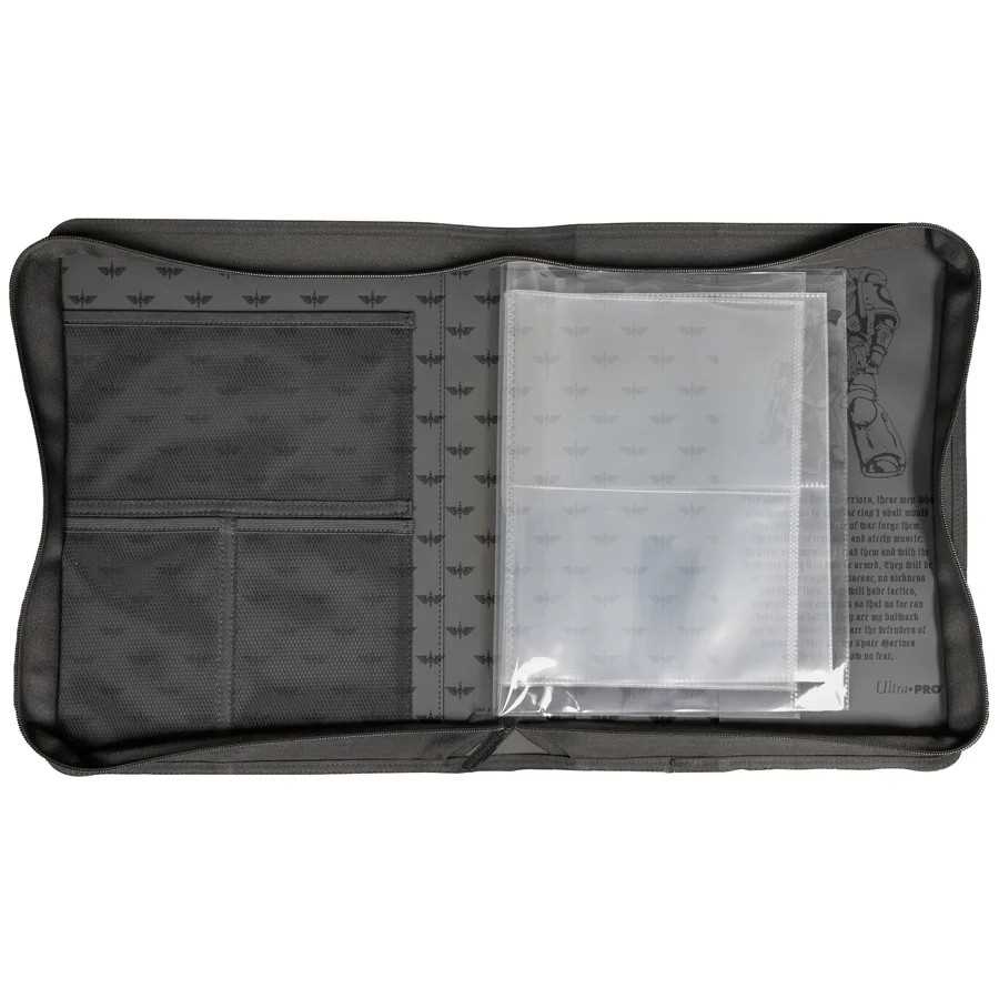 “In the grim darkness of the far future there is only war”, so prepare for battle with tabletop accessories for Warhammer 40,000! This Space Marines Codex Book Folio fits and protects your latest Warhammer 40,000 Codex or Core Book inside an easy-load back cover pocket. The textured leatherette cover features a gold foil Space Marine, Adeptus Astartes symbol, and faction emblems, with a spot UV Space Marine on the interior. Inside, you’ll find two 1-pocket pages to store notes and army printouts (A4 or 8.5in. x 11in.), five double-sided 4-pocket pages for your datasheets or index cards, and three elastic net pockets to store any additional accessories like measuring tape, dice, or mission decks, plus a handy elastic loop for a pen or pencil. Secure everything inside with the outer zipper, and use the carrying handle to easily transport your Codex Book Folio across the battlefield.