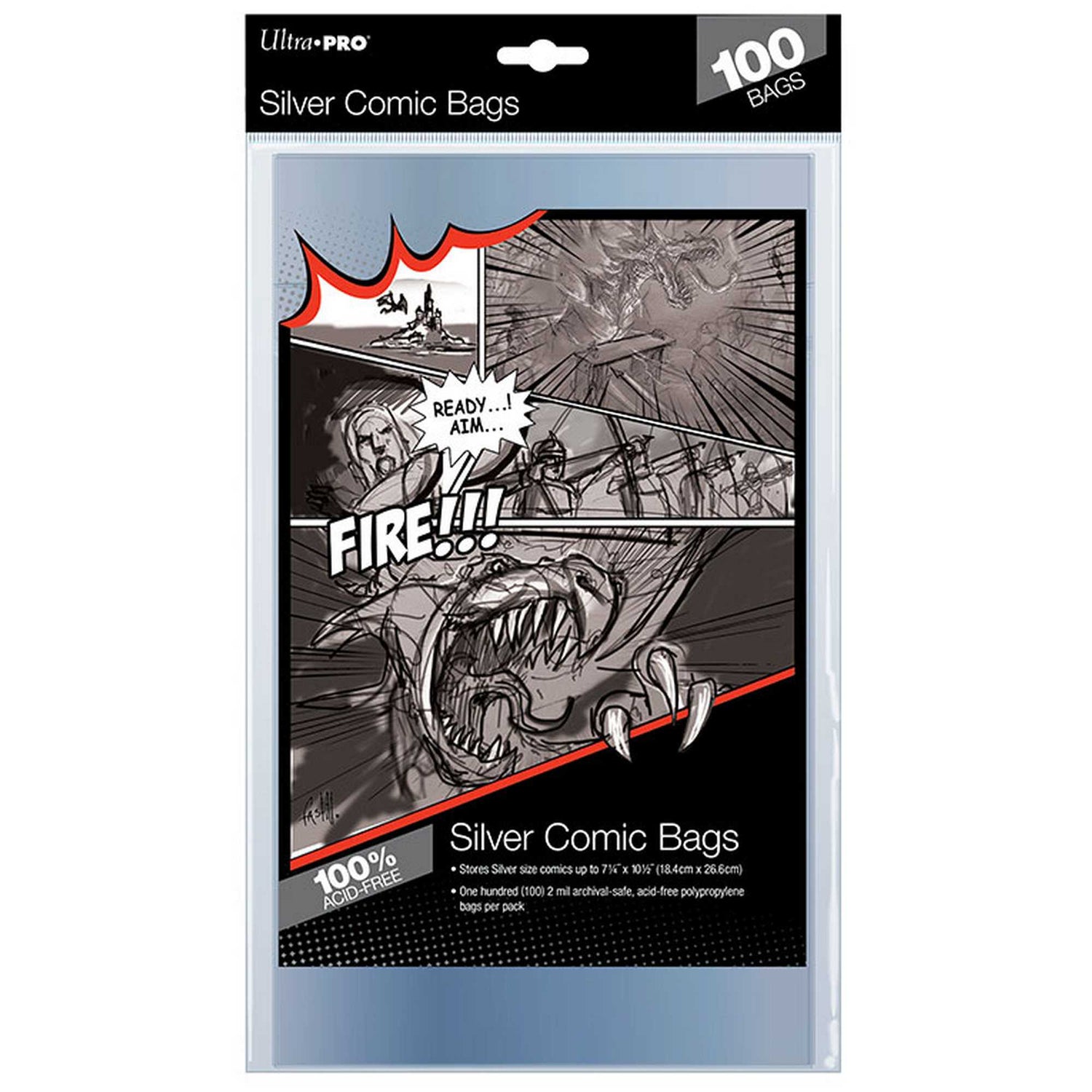Ultra-clear, archival-safe comic bags designed to fit Silver Age-size comics up to 7 1/4" x 10.5" in dimension. Each pack contains 100 bags, acid free and with no PVC.