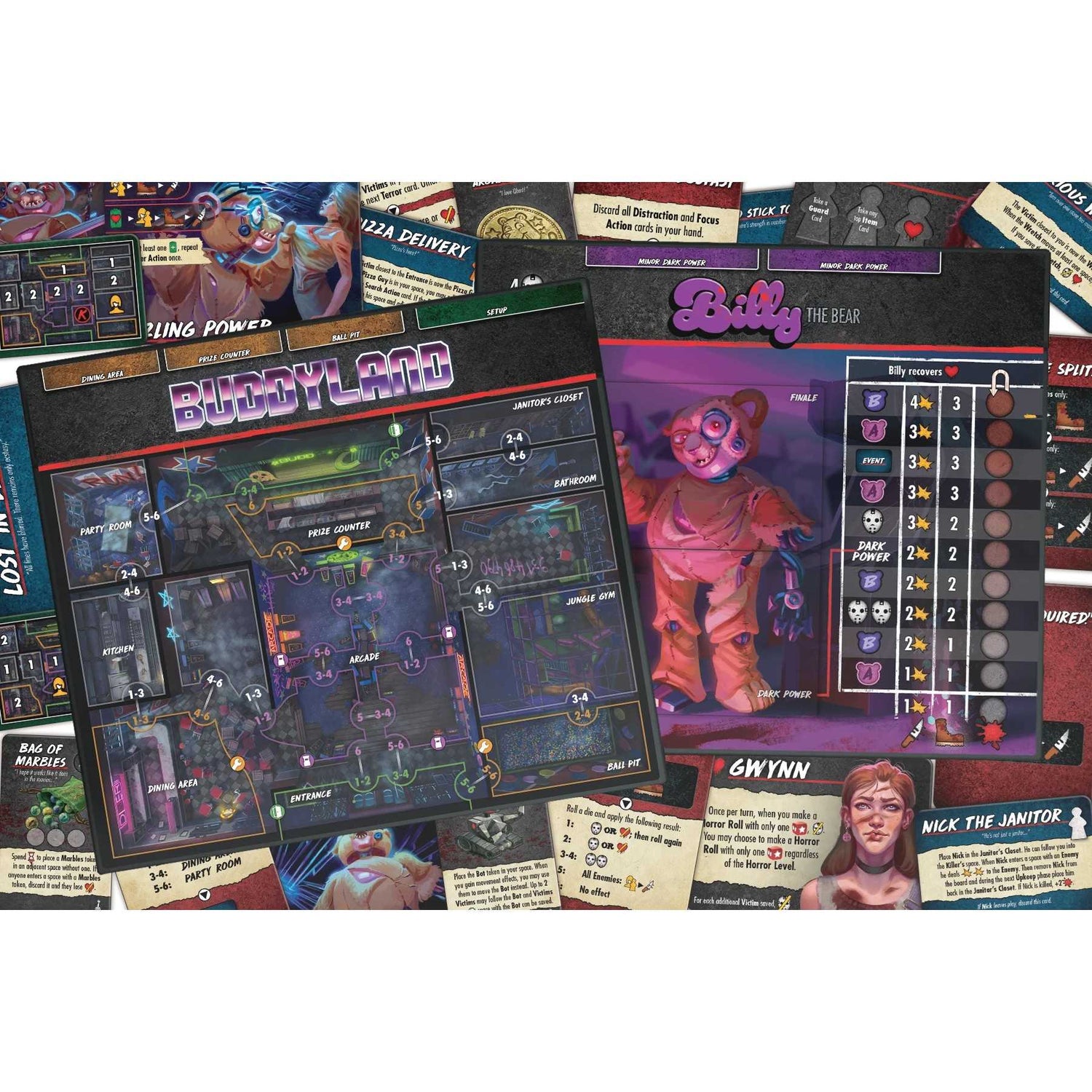 For years, Billy Bear and his animatronic Buddies entertained kids and adults alike. Now Billy is out to kill you and anyone else in his path—and joining him might be one, two, three, or all seven Buddies... the variable setup will make it a surprise each time. Be sure to turn off Billy’s power supplies or he’ll just keep recharging. Good luck surviving the night!