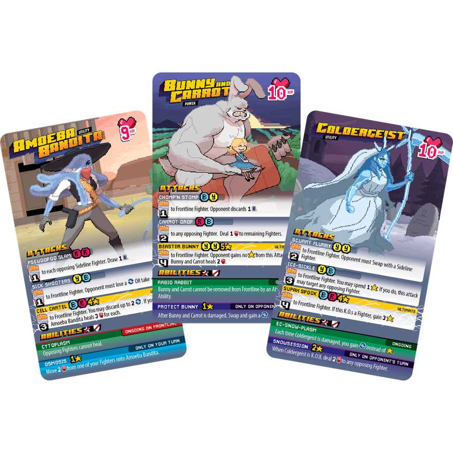 Relive classic arcade action with this two-player dueling card game based on 3-vs-3 tag-team arcade fighters such as Sharkfist, Slumberjack and Tyranosorcerer! Draft from a group of 15 fighters, each with their own abilities and evocative pixel art, then play 'button cards' to execute attacks and chain combos.
